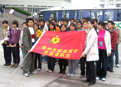 近几年来,我校一直非常重视无偿献血工作。我院团委、工会曾多次组织大规模献血活动。许多学生和教工的献血热情曾让血站工作人员印象深刻,感动不已。2004年,学院团委曾被授予温州市献血先进集体;2005年,我院还建立了温州市首支成分献血志愿队。我院也成为了温州市首个成分献血基地。