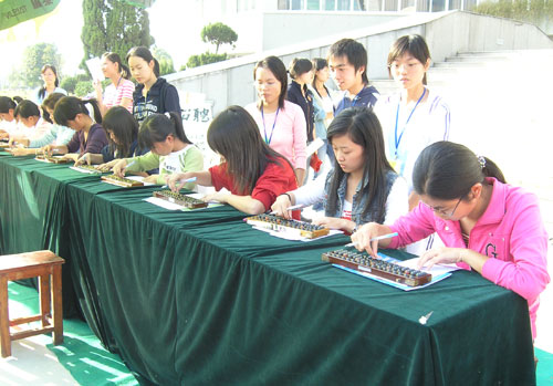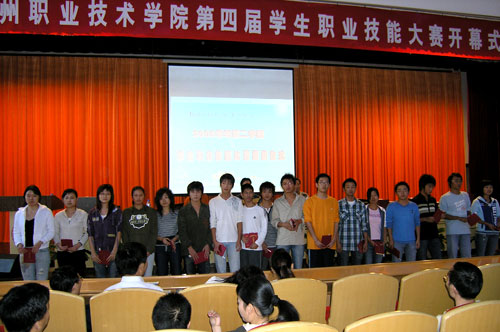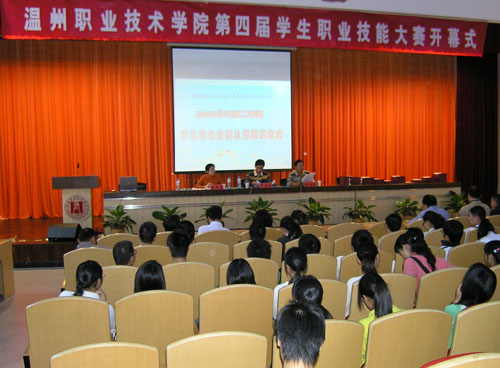 11月8日,在我院学术报告厅举行了第四届大学生职业技能大赛开幕式,有2600多名学生将参加技能比武,参赛面广,规模宏大。本次比赛共设建筑测量、建筑CAD、手工制图、时装画技法、概念鞋设计、样板制作、手绘室内设计、电脑平面设计、电脑装机、POP广告设计、文字录入、文秘综合技能竞赛、公文制作、办公实务案例处理、英语词汇阅读、商务英语翻译、电子CAD 、C语言程序设计、电子装接、手工记账、点钞、珠算、汉字录入、证券模拟投资、数控车、数控铣、加工中心、创业计划、电子商务技能、职业生涯设计、毕业生自我、推销设计方案、广告策划、模拟导游、宴会摆台、餐巾折花、外贸专业英语翻译比赛等42个项目,比赛将为期三个月。