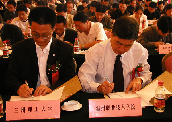 2003年10月14日,市政府在温州王朝大酒店举行了2003年中国国际轻工产品(温州)博览会科技合作交流会签约仪式。在仪式上,我院与兰州理工大学达成了合作办学协议并现场签约。