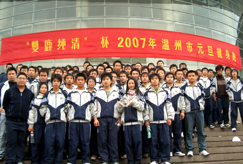 在升旗仪式之后,我院近百名师生参加了健身跑活动,他们面带微笑,以昂扬的精神面貌跑进了2007年。在终点处,许多同学在“与奥运同行”的红色横幅上,庄重的签下了自己的名字,快乐地许下新年心愿:新的一年,新的希望。