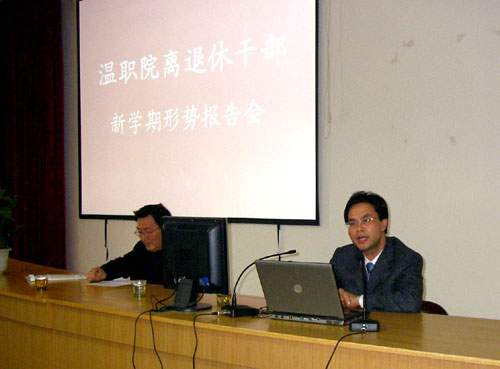 3月23日下午,我院在成教学院一楼阶梯教室召开了离退休老干部形势报告会。院长丁金昌作工作报告。会议由组织部长刘世长主持。