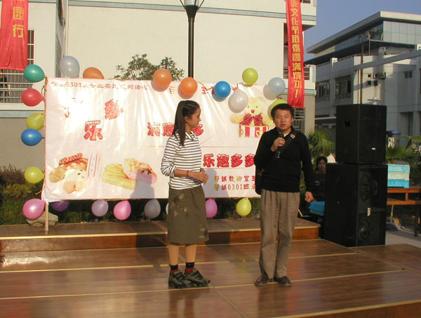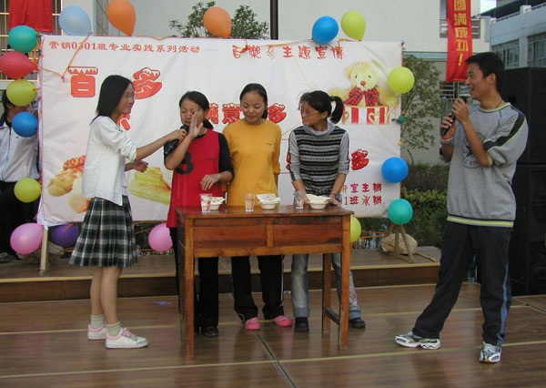 10月29日下午,学生公寓楼前一角人头攒动,在营销教研室的牵头下,营销0301班率先把课堂搬到了教室外。一堂营销0301班营销品牌宣传课在同学的自编自导下拉开了序幕。他们这次宣传的品牌是在同学们心目中并不熟悉的“百乐多”面包。营销专业同学在活动之前已经通过海报、横幅、宣传单、征文比赛等手段宣传了品牌,取得了一定的效果,一时之间“百乐多——满意多多、乐趣多多”的品牌被很多同学所熟知。这场户外品牌主题宣传作为系列品牌宣传一个内容由此应运而生,以使“百乐多”品牌在校园中更加深入人心。
