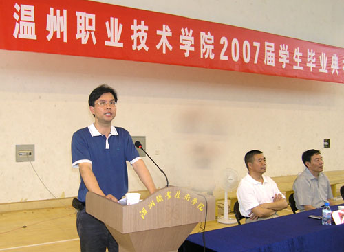 典礼上,教师代表张小加发自肺腑的话语道出了老师对学生无微不至的关爱,他希望每一位毕业生把毕业看作是人生的一个新起点。毕业生代表吴龙凤用一段真情告白,回顾了大学三年的成长足迹之外,更充满着对母校、对老师的感恩、留恋和依依不舍,她代表每一位即将离开的温职学子庄重宣誓——明天的温职院要以我们为荣。