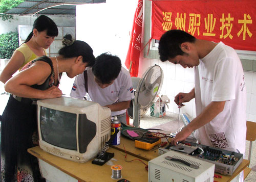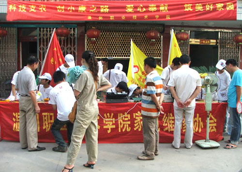 今年的暑期实践活动正红红火火的在各地开展。我院电气系的暑期实践免费家电维修队今年的服务地点是龙湾永中街道。几年来,这支免费维修队走街串巷,不辞辛劳,分别辗转了红色根据地——文成西坑、洞头海岛等,为当地的群众热情服务,把温职院学生良好的形象带到农村、社区和城镇。