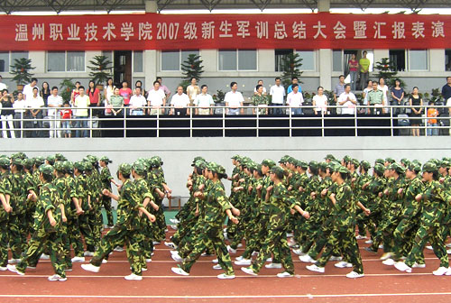 9月15日下午,我院“2007级新生军训总结大会暨汇报表演”在学校田径场隆重举行。我院院长丁金昌,温州军分区政治部副主任沈业之,学院领导倪集崇、夏晓军、兰玉景、王向红、何忠以及温州海防营陈明教导员等出席了会议。大会由副院长王向红主持。丁金昌院长与温州军分区政治部领导一同检阅了军训队伍。