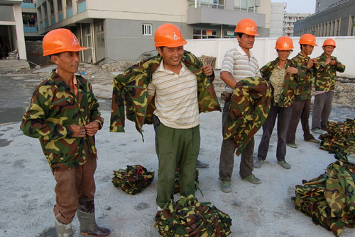建筑工地民工试穿衣服