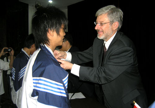 理查德先生为新生佩带BCIT校徽