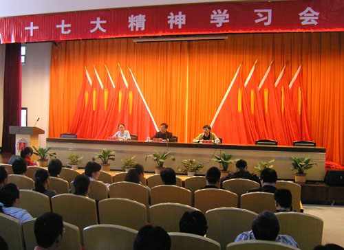 十七大的胜利召开不仅在国内外引起了巨大反响,也引起了国内广大高校师生的高度关注。近期,在我院校园内也掀起了学习十七大精神活动的高潮。院系两级组织、学生党员、学生干部纷纷开展各种形式的十七大会议精神学习活动,力求把十七大精神传达给每一位党员及师生,学校学习十七大精神活动逐步铺展开来。