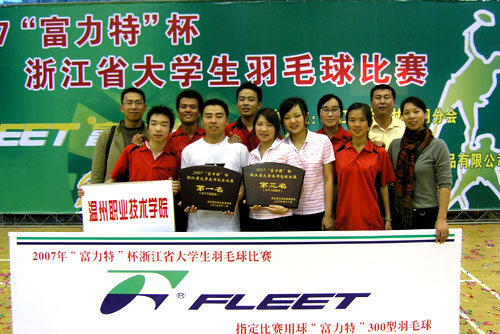 12月10日,2007年浙江省大学生羽毛球在温州医学院落下帷幕。我院参赛选手表现出色,共夺得二金一银两铜。其中,我院马海龙、葛晨强、章春常、林良成、章朝旭五人荣登男子乙组团体冠军宝座,马海龙/葛晨强合作获得了男双冠军、马海龙摘取了男子单打亚军,在男子项目,我院大包大揽,打出了温职院运动员的气势和良好精神风貌。我院周晴、赵莉莉、金华丹、施小影四名同学也发挥了水平,获得了女子乙组团体第三名,周晴/赵莉莉还摘取了女子双打第三名。此外,我院公共教学部严小娟老师还被大会组委会评选为“优秀教练员”。