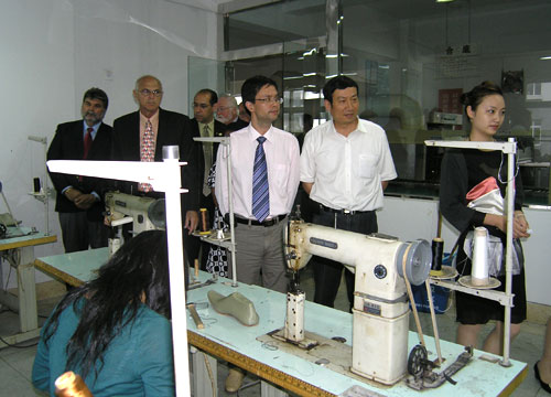 在参观我院实训基地时,美国客人对我院的鞋机实训基地格外感兴趣,频频向翻译提问。一进入我院的精品鞋陈列室,外宾人就发出了“OH,BEAUTIFUL!(太漂亮了)”的感慨。同时,美国客人还对我院“三个合一”的生产性实训基地建设理念赞赏有加。