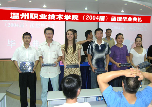 8月1日,我院成教学院举行了2004届毕业典礼。两百多名成教学员顺利修完学分顺利毕业,其中有136人获得浙江工商大学(原杭州商学院)函授本科、专科文凭,有103人获得我院成教学院颁发的大专文凭,并有7人获得学士学位。我院成教学院又为社会输送了一批优秀的毕业生。