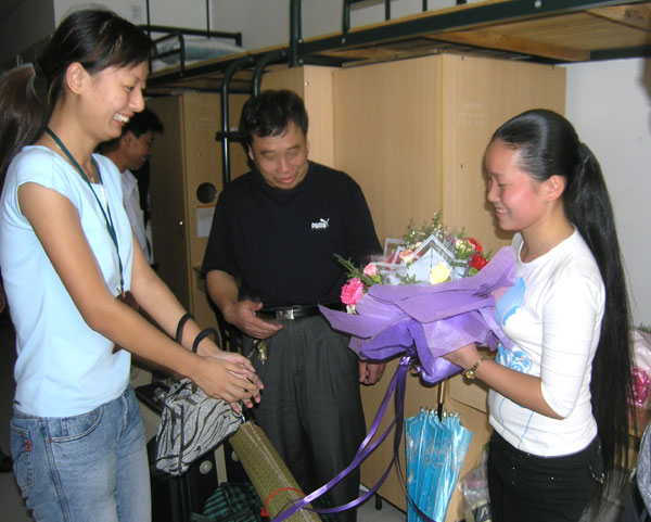 金万双在学校注册报到时,还受到她所录取的系——工商管理系有关领导和同学的关怀。一位学生党员与其建立了结对关系,在生活、学习方面给予帮助。在宿舍,金万双受到了室友和同学的欢迎,同学们纷纷为她献上鲜花表示欢迎。“姐妹们”细心为她整理好了床铺,并带她参观了校园,办好了入学手续。在众人的帮忙下,金万双的入学手续办得相当顺利,她脸上的笑容格外灿烂。