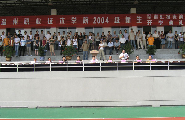 金秋九月,秋风送爽。9月18日,2004级新生军训汇报表演仪式暨开学典礼在我院田径运动场隆重举行。温州军分区领导童显裳,学院党委书记、院长周锦成发表了热情洋溢的讲话,我院党委副书记倪集崇主持大会。蓝玉景副院长对军训情况做了总结。学院党委领导,各系书记、辅导员,新生班主任都出席了大会。