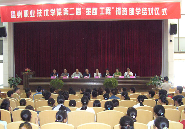 据悉,“金瓯工程”是由鹿城区妇联、女企业家协会发起的,专门以资助贫困学生为主要形式的一项活动,此次已经是第二次在我院举行。此前,温州鹿城区妇联和女企业家协会的16名“爱心大使”在去年已经与我院的34名贫困生结成对子,并已经扶助10多名贫困生完成了三年的学业,顺利走上了工作岗位。本次活动的捐助者队伍较前次更为庞大,除了温州市鹿城区妇联和女企业家协会的会员外,还有温州市鹿城区侨办、财政局、卫生局、建设银行的领导和工作人员以及我院人文系几位教师等社会各界人士都纷纷参与了捐助、结对贫困生活动。其中,一名旅日华侨吴晓斌先生也在区侨办的牵线下,与十名贫困生结成了对子。