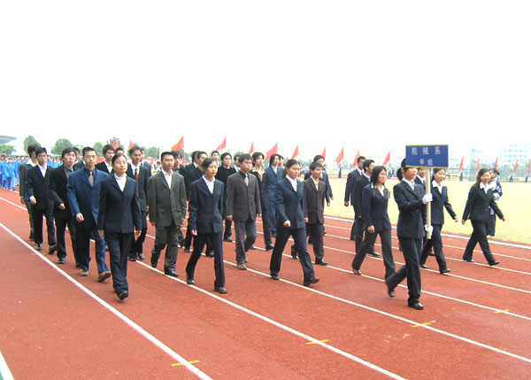 开幕式上,各系纷纷亮出了自己的口号和特色。机械系整齐的着装赢得一片喝彩,工商系一面大会旗也引来许多关注的目光。学院各系经过精心的准备展现了特色和风采。简短的开幕式让在场的啦啦队兴奋不已,掌声、呐喊声、锣鼓声、喇叭声让校运会上的硝烟味变得更加浓厚。