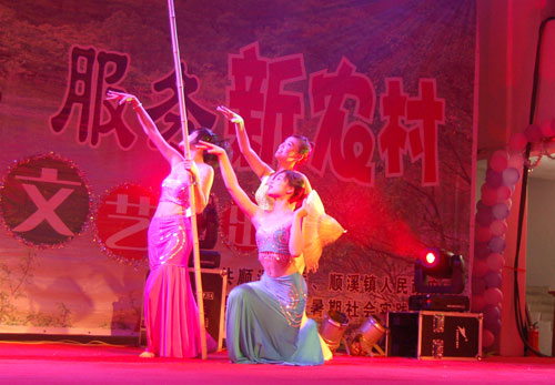 晚会上,大学生们表演了民族气息的舞蹈、把迎奥运的歌曲融合到晚会主题中,在乡村里“种”下了文化的种子。演员们纷纷拿出“看家本领”,载歌载舞,赢得顺溪镇父老乡亲阵阵喝彩声。台前,还有些“小脑袋”在人群中钻来钻去,小朋友们却特别衷爱大学生们表演的现代街舞,每到精彩处,几个小朋友现场照着动作自己也随着节奏不“比划”了起来。一位村民说:“现在农村里也不愁吃,不愁穿,但平时象这样的演出很少,大家都觉得普遍感觉在精神上少了东西。这次大学生们为我们送来了文化大餐,让我们很高兴。”