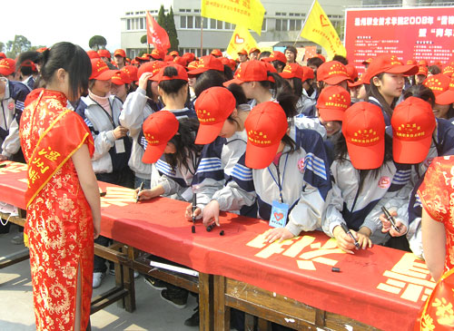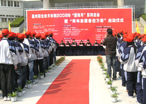 ; ; ; 2008年3月5日,浙江省第一个志愿者服务日,在温州职业技术学院信息楼前隆重举行2008年“雷锋月”系列活动暨青年志愿者进万家启动仪式,青年志愿者代表们整齐列队,庄严宣誓:“尽已所能,不计报酬,帮助他人,服务社会。实行志愿精神,传播先进文化,为建设团结互助、平等友爱、共同前进的美好社会贡献力量。”各支志愿者队伍从学院领导手中接过了志愿者旗帜,他们将积极地投身于这次志愿者集中服务的大热潮中。 ;