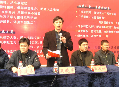 学院副院长夏晓军出席了此次启动仪式。他指出,在新的形势下,青年大学生学雷锋,最根本的是要用“三个代表”重要思想武装头脑、指导实践;要不断地丰富雷锋精神的思想内涵,弘扬雷锋精神的时代价值,要发扬雷锋的爱国精神、奉献精神和奋斗精神,要紧紧围绕国家的需要、人民的需要,去努力构建一个相互尊重、相互关爱的和谐社会、和谐校园。他希望大学生们能成为一个落实科学发展观的先锋者,成为一个建设文明社会的排头兵,成为一个弘扬雷锋精神的实践者。