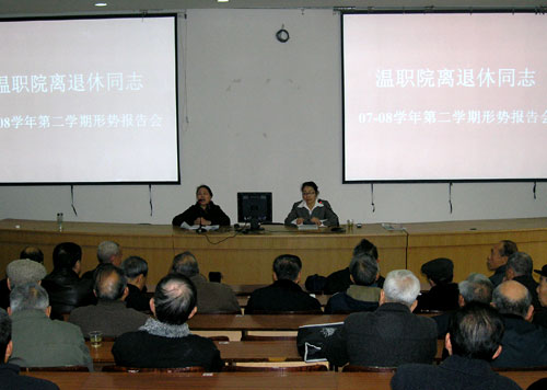 3月6日上午,我院召开2008年离退休干部形势报告会。副院长王向红分别从上学期主要工作情况,学院当前面临的挑战、存在的问题与机遇,示范建设内容,新学期工作要点等四个方面通报了学院建设与发展情况。100多名离退休老干部出席听取了报告。