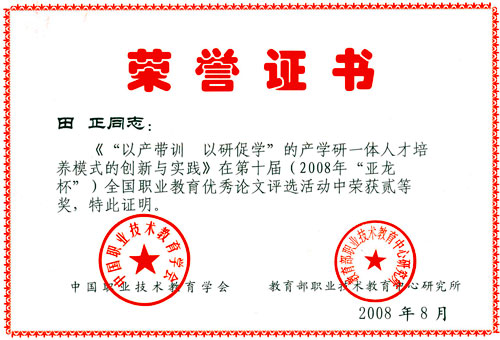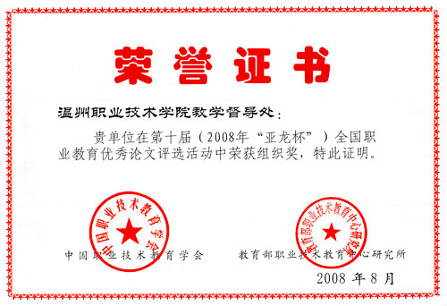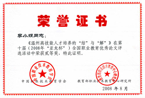 日前,从《中国职业技术教育》杂志社传来喜讯,我院在2008年“亚龙杯”全国职业教育优秀论文评选活动中获得佳绩,选送的5篇参评论文中有4篇论文获奖,其中田正老师的《“以产带训 以研促学”的产学研一体人才培养模式的创新与实践》和李小娟老师的《温州高技能人才培养的“结”与“解”》两篇论文喜获二等奖;阮婧老师的《高职高等数学作业布置及批改模式改革探索》获得三等奖;易淼清老师的《从德国的“双元制”职业教育模式看我国高职教育师资的建设与管理》被授予优秀奖。这成绩也充分体现了广大教师在职教研究上所作出的努力,也为我院国家示范性高职建设工作增添亮色。另外,由于积极组织、报送及时,选送的稿件优质,我院教学督导处被授予评选活动的“优秀组织单位奖”。