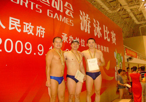 陈军清老师(居中)荣获男子乙组50m和100m蛙泳第一名