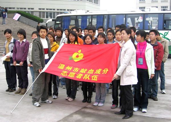 3月8日,我院成立了成分献血志愿队伍,这是温州市首支成分献血志愿者队伍。志愿者们在信息楼前举行了简单的队伍成立仪式,我院共有100多名同学自愿加入了捐献血小板队伍。面对无偿献血志愿者队伍,志愿者们庄严宣誓,表达了恪守 “人道、博爱、奉献”的红十字会精神,无偿献血、奉献社会的决心。这支献血志愿队队将会义务组织、参加各类无偿献血宣传活动,并在非常时期支援血库,成为较为固定的、首当其冲的无偿献血者。