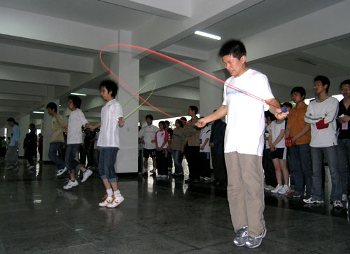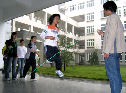 如果不是亲眼所见,难以想象跳绳项目这种童年的游戏竟然会如此受到大学生欢迎。4月12日下午,学院信息楼前和2、3号楼楼下到处是三五成群、甩绳穿梭的影子,工商系首届运动会推出的跳绳比赛在绵绵春雨中揭开战幕,工商系20多个班级300多名运动员齐上阵,场面煞是壮观。跳绳比赛设置了单人跳和集体8字长绳比赛。