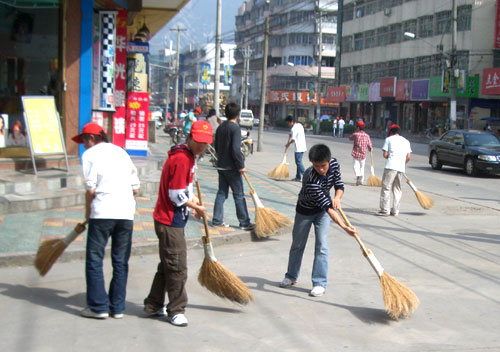 志愿者清扫茶山镇梅泉路大街