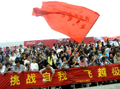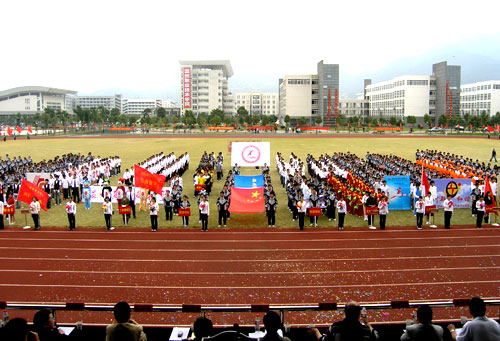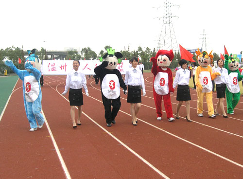 随后进行的运动员入场式成了各系比拼“创意”的舞台。成教学院的腰鼓震天响、财会系的礼炮飞上天、建工系运动员戴起了实训中用到的安全帽……而工商系学生扮演的的“福娃”一亮相,更是吸引无数目光,赢得阵阵喝彩。五个可爱的2008年奥运会吉祥物——“福娃”摇摇晃晃地走进赛场,憨态可拘,拼命地向观众们挥手,还不时地向观众的送去飞吻,笑得观众们人仰马翻,拉拉队也敲起了有节奏的锣鼓来迎合“福娃”。同学们正以青春、激情来迎接2008年北京奥运会。