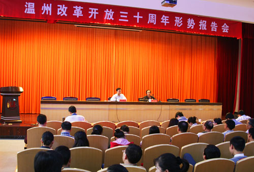 “创新引领温州,创业改变生活,创意成就未来”。11月5日,温州市社科联副主席洪振宁教授专门应邀来我院,在学术报告厅做了一场“温州改革开放三十周年形势报告会”。全院党员、教师、行政科级以上干部聆听了报告。
