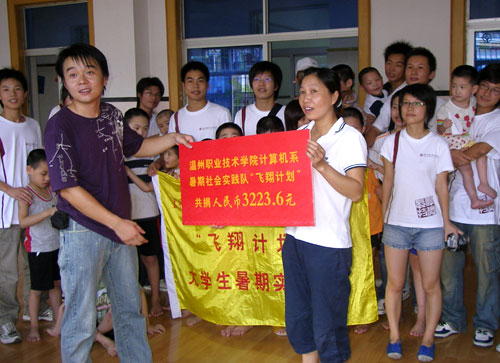 7月29日上午,我院参加“生存挑战”的15名暑期实践同学来到温州儿童福利院,把一个装有3223.6元钱的信封交到了儿童福利院。这3223.6元钱凝聚着这些大学生半个月来的酸甜苦辣,是经历“饥饿、劳累、遭质疑、被拒绝”等生存挑战后换来的。这3223.6元钱代表爱心的同时,也有许多“生存挑战”背后一些不平常的故事——