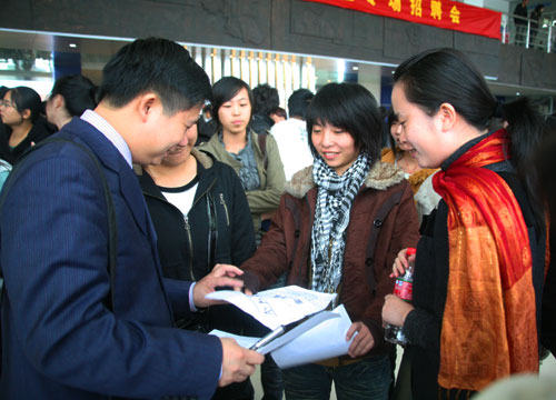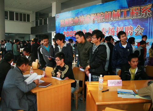 金融危机,让今年的毕业生求职市场蒙上了一层霜,与去年同期相比今年企业招聘人员的数量减少了很多,对选择人才的要求也增加了不少。但针对今年毕业生创历史新高,又面临着就业寒冬双层压力,我院由招生就业处牵头,各系纷纷举行就业招聘会,切实为毕业生服务,寻求就业岗位。12月3日,电气系率先邀请鹿城区电子行业协会带领了30多家企业走进校园召开就业专场招聘会,计算机系、工商系、轻工系、机械系等纷纷在学院就业招聘大厅和图书馆一楼举行专场招聘会。12月24日,建工系还将举行本学期最后一场专场招聘会,六场就业招聘专场会吸引了海特克、法派、特福隆等知名企业入场,为我院毕业生提供了更多就业机会。在轻工系专场招聘会上,法派集团还为我院“重庆班”单独组织面试,许多重庆学生将在温州实现就业。招聘会上,学院领导丁金昌、夏晓军等亲临现场了解毕业生就业情况。