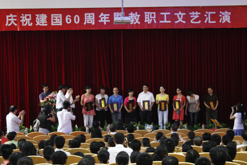 文艺汇演之前,学院举行了简短而庄重的“庆祝建国60周年暨学院师德先进个人颁奖仪式”,仪式由丁金昌院长主持,陈光天书记作了热情洋溢的讲话。陈书记回顾了中国自1840年鸦片战争以来的历史,他指出经过建国60年,特别是改革开放30年来艰苦卓绝的奋斗,昔日积贫积弱的中国发生了翻天覆地的历史巨变。勤劳、勇敢、智慧的中国人民在党的领导下,在古老的华夏大地上创造了举世惊叹的人间奇迹。在中国特色社会主义建设伟大事业进入新时期、踏上新征程之际,我院也迎来了发展历程中一个新的十年。十年来,我院整合了多方资源,实现了办学层次、办学水平、办学效益和社会声誉的大幅提升,高职教育的温州模式在全国打响了品牌。在祖国60周年华诞之际,陈书记祝愿祖国繁荣富强,也祝愿我院开创国家示范院校建设的新局面。随后,院党委副书记倪集崇宣读了《关于表彰温州职业技术学院师德先进个人的通知》,对苏北春等十位师德先进个人进行了表彰。