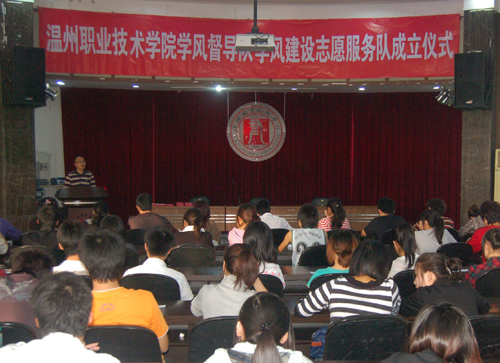 10月23日下午,学风督导队和志愿服务队的成立仪式在行政楼多功能厅举行。学工部部长、学生处处长、团委书记蔡后界、各系团总支书记和院系学风督导队成员代表、志愿者代表等参加了活动。仪式由院团委副书记吴冰主持。