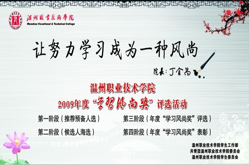 为促进学院的学风建设,营造一个勤奋好学,积极向上的校园文化氛围,院学工部、团委、学生会特推出温州职业技术学院2009年度“学习风尚奖”评选活动。本活动旨在为广大“学风端正严谨、学习成绩优异、职业技能突出”的学生提供一个自我展示的平台,希望通过形式多样、内容丰富的校园文化活动载体,树立勤于学习、善于学习的先进典型,以激励更多的学生努力学习、大胆实践、锐意进取。
