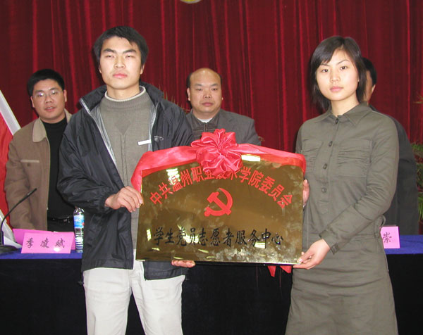 随后,举行了“学生党员志愿者服务中心成立”授牌仪式,学院党委委员、副院长蓝玉景颁发了牌子。
