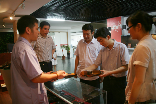 仇杨均副市长细致查看了学生设计的鞋样作品