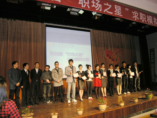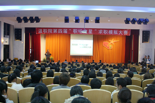 12月2日晚,由我院招生就业处主办、财会系协办的第四届“职场之星”模拟求职大赛在学术报告厅如期举行。《温州商报》就业版资深记者王木正,03届企业管理专业校友、温州国豪实业有限公司人力总监谢道光,04届财会专业校友、温州跨海网络技术有限公司副总经理金勇、02届市场营销专业校友、太平人寿保险公司营销部经理郑理、原组建单位——温州商校98届校友、太平人寿保险公司业务部经理林成游等五位嘉宾担任本次大赛的评委。