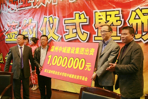 据悉,中城建设集团是中国民营企业500强之一,中国建筑业领先企业,温州市二十强企业。中城建设奖学基金,由中城建设集团出资100万元人民币设立,主要面向建筑类专业学生进行奖励,每学年一次,最高奖金额为5000元。双方合作开设“中城建设班”更表明了我院的办学理念和办学模式已经得到了社会的关注和认可,校企合作已经跨入“快车道”。