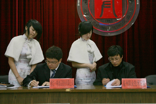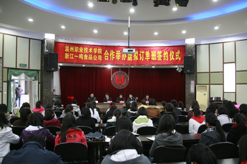 1月6日,我院与浙江一鸣食品股份有限公司举行合作组建虚拟订单班签字仪式。我院副院长夏晓军,一鸣公司总经理朱立科,我院招生就业处副处长吴建明、金建孟,一鸣公司人力资源部经理熊锋以及来自我院17个专业的132名“一鸣虚拟订单班”的学生参加签字仪式。