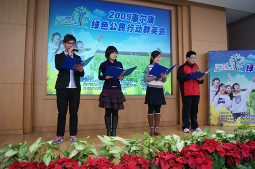 据了解,本次惠尔康绿色公民行动于2009年11月1日正式启动,其中“杭温百名大学生绿色接力大比拼”更是在浙江高校中如火如荼地开展。行动立足于大学生这个特殊群体,在杭州、温州两地征集百名“绿色巡讲员”,通过巡讲员在学校、社区等公共场所开展宣传“低碳生活”的公益性活动,调动起大学生的创意和环保积极性,并带动起全社会对“低碳生活”方式的关注。
