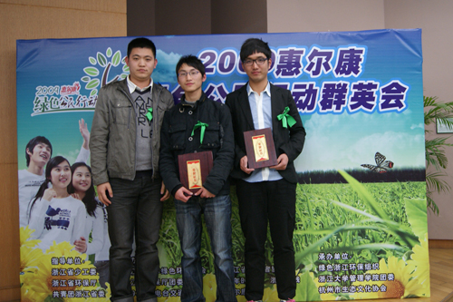 1月16日下午,绿色浙江2009年度颁奖典礼暨惠尔康绿色公民行动群英会在浙江大学紫金港校区国际会议中心隆重举行。本次大会以“绿色低碳生活”为主题,由浙江省青年绿色环保协会、省环保厅团委、浙江省志愿者协会、青年时报社、浙江在线、浙江电台交通之声和惠尔康集团共同主办,旨在表彰2009年度为绿色浙江作出贡献的先进个人和集体。团省委、浙江省环保厅和浙江大学的有关领导出席了本次颁奖典礼。典礼上,原杭州市人大副主任、九三学社浙江省副主委、九三学社中央委员朱荫湄教授对“杭温百名大学生绿色接力大比拼”的十佳巡讲员颁发了荣誉证书,来自我院建工系的两位选手也获此殊荣,并接受了浙江电视台、杭州电视台的记者采访。