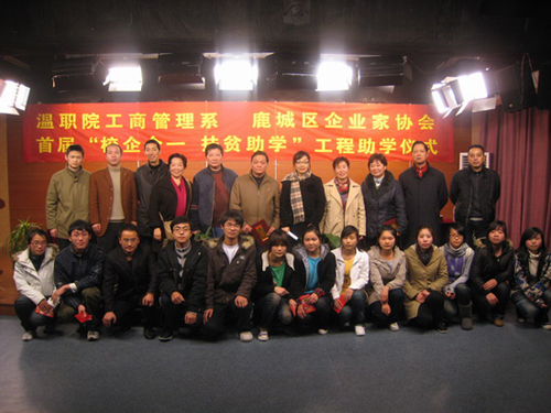 1月19日,温职院校园内爱心涌动,来自温州市鹿城区企业家协会的企业家们与工商系近百名同学集聚一起,举行首届“校企合一 扶贫助学”助学工程结对仪式,把一份份温暖播撒到困难同学的心中。