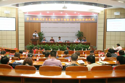 10月25日上午,由我院承办的第三期温州片区高校校际干部联合培训班开班仪式在我院多功能厅举行。仪式由温州医学院党委副书记唐闻捷主持,我院党委书记陈光天出席开班仪式并致辞,温州各高校党委组织部门负责人、全体参加培训学员出席了开班仪式。