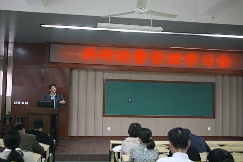 知识产权讲座之后,系部主任和35所省、市、院三级应用研究与技术服务机构的负责人参加了高校科研经费管理专题学习会。科技开发处林海平副处长通报了“省市县联合科技经费大检查的自查情况”; 监察审计室陈维彬主任对科研经费调研情况作了分析说明;纪委何忠书记对加强科研经费使用、管理、制度建设等方面作了重要部署,要求各系部主任组织系部教职员工对高校科研经费管理的相关政策文件开展专题学习。