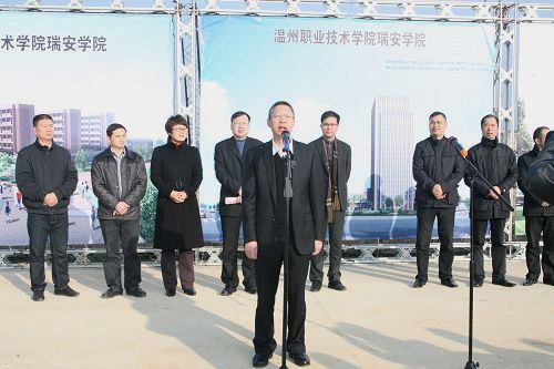瑞安市江南新区党委书记陈明仁简要介绍瑞安学院工程概况和前期筹建情况。随后,瑞安市委书记陈建明宣布温州职业技术学院瑞安学院新校区建设正式启动。这标志着我院与瑞安市的合作办学迈入实质性阶段。