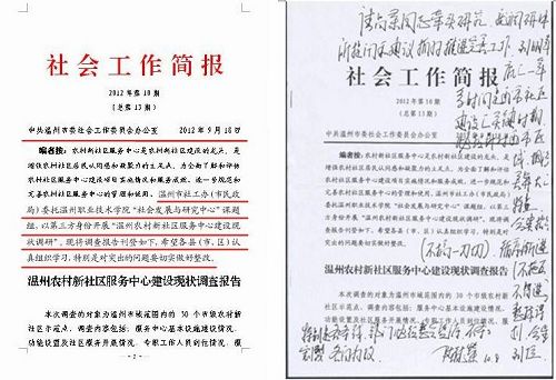 这份调研报告是人文系主任丁丽燕教授和四位老师暑期到温州十一个县(市、区)对30个农村示范新社区进行深度调研的成果,题为“温州农村新社区服务中心建设现状调查报告”。陈德荣书记阅后批示,要求市相关负责领导“牵头研究,就调研中提出的建议抓好推进完善工作”。