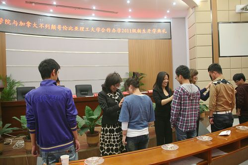 随后,教师代表和学生代表分别作了发言。两校领导还一同为2011级新生佩戴了BCIT校徽并合影留念。