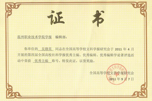 为更好地总结高校学报的办刊经验,促进高校学报编辑队伍建设,推动高校社科学报的建设与发展,全国高等学校文科学报研究会于2011年4月开展了第四届全国高校社科期刊优秀主编、优秀编辑、优秀编辑学论著评选活动。经各省市学报研究会初评、推荐,评优领导小组最终审定,我院学报执行主编、编辑部主任吴赣英被评为“全国高校社科学报优秀主编”,其撰写的“学术期刊对科研成果评价的理性反思”被评为“全国高校社科学报优秀编辑学论文”。