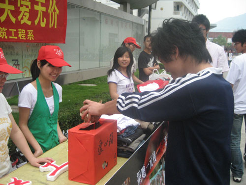 当日中午,建筑工程系在食堂楼前开展“捐赠一元钱,爱心送汶川”募捐活动。现场气氛活跃而温馨,同学们自己设计的赈灾宣传画、飘荡在风中的横幅以及身穿“心系灾区,爱心捐助”绶带的志愿者吸引了众多来往的师生和路人,同学、老师纷纷停下自行车或脚步,将身边的钱款一一捐出,连食堂员工、餐厅小卖部的电员也纷纷加入献爱心的行列。一些热心的同学还掏出手机给众多朋友群发短信动员捐款。为了方便同学们献爱心,学生食堂特意安排了小卖部的定额刷卡机,让没带零钱的同学,以在饭卡刷一元钱的形式来募捐。没过多久,同学们送来的衣服、被褥、鞋子、学习用品很快就堆成“小山丘”。在整理这些赈灾物资时,工作人员还发现一些感动的字条,字条里满是对灾区人民祝福的言语。